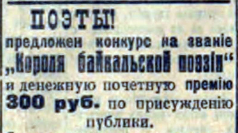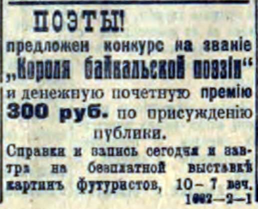 «Поэты! Предложен конкурс на звание короля байкальской «поэзии» и денежную премию по присуждению публики», – сообщалось в афише. В том же самом номере «Нашего дела», где на передовице появилась эта афиша, на последней странице в разделе объявлений Бурлюк снова напомнил о «Короле байкальской поэзии», на этот раз указав сумму вознаграждения – 300 рублей. К сожалению, пока не найдено сведений, кому же из иркутских поэтов был вручён титул. О том, что акция не была просто рекламным ходом, свидетельствуют омские события. Омич Антон Сорокин, который, по некоторым сведениям, сопровождал Бурлюка в Иркутске, получил лично от Бурлюка титул «Короля сибирских писателей». Значит, такой же титул, но поэтический, был у кого-то из иркутских литераторов. Но у кого? Зато на странице частных объявлений в одном из номеров «Нашего дела» было найдена ещё одна крохотная заметка от футуристов. «Редкость! Кто поленится пойти купить «Газету футуристов» – гласила заметка и давался адрес, где можно купить газету: «Губернская земская управа по Большой улице…».