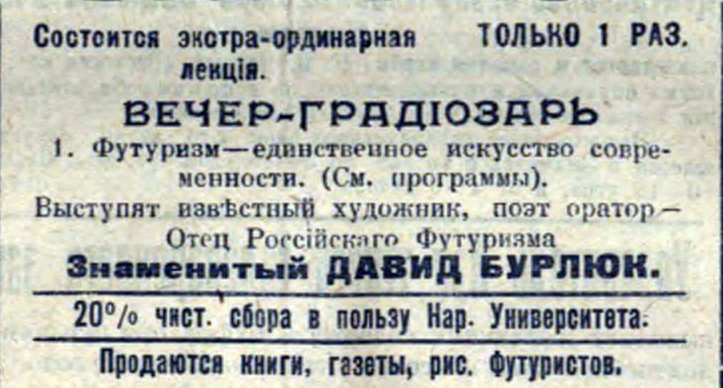Критик призывал «большого» Маринетти, «младших» – Илью Зданевича, Шкловского, Брика – обратить внимание на Бурлюка, деятельность которого, по-видимому, считал профанацией идей футуризма. Он заключал, что целью его статьи была защита «от маргарина в футуризме». «Бурлюк, имя которого упоминается на нескольких языках, кажется авторитетом, – считал аноним. – Ткнёт в Бодаревского, во всю академию, скажет: «Футуризм», – поверят. Осторожно!» (Николай Бодаревский – передвижник, портретист. – Авт.) А сам Давид Бурлюк, по-видимому, на эти уколы реагировал философски. И продавал картины, как чеки.