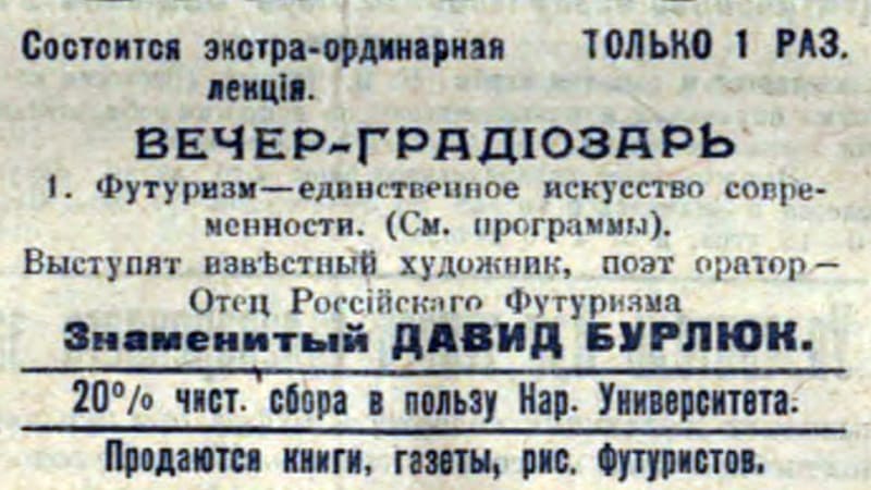 9 мая будет 98 лет, как Давид Бурлюк посетил Иркутск. Лаконичная запись в летописи Нита Романова за 1919 год гласит: «9–11 мая – выставка футуристов». В летописи Юрия Колмакова находим другое: «3 мая. В фойе Общественного собрания открылась выставка картин художника-футуриста Д. Бурлюка». Где брал сведения Юрий Колмаков, неизвестно. Однако газеты, свидетели тех лет, говорят в пользу Нита Романова – афиши выставки стали размещаться в печати с 9 мая. «Давид Бурлюк, Давид Бурлюк, Давид Бурлюк. Великий футурист, великий футурист, великий футурист» – с такой афишей на передовице 9 мая вышла газета «Наше дело», выпускавшаяся в Иркутске в 1918-1919 годах обществом потребителей, служащих и рабочих Забайкальской железной дороги. «Отец российского футуризма и председатель федерации футуристов России», как гласила афиша, привёз с собою Пуантиллину Норвежскую (под этим псевдонимом скрывалась Марианна Бурлюк, младшая сестра футуриста. – Авт.), Бориса Четверикова. Вход на выставку был бесплатным, а размещалась она в здании губернской земской управы, что по улице Большой. «Первый раз в Сибири – футуризм! Идите на выставку, узнаете всё», – зазывала афиша. Бурлюк представлял выставку картин «известных художников Москвы и Петрограда», обещая 300 номеров футуристической живописи. Ежедневно в 12 часов на выставке шли поэтические диспуты. А 20% средств от продажи картин организаторы обещали отдать в фонд Народного университета (Давид Бурлюк делал такие анонсы и в других городах сибирского турне, например, в марте 1919 года в омской «Сибирской речи» сообщалось, что часть сбора пойдёт на сооружение школы имени Врубеля. – Авт.).