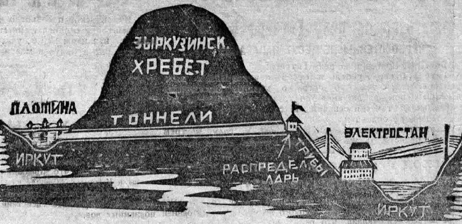Объезжая верхом вместе с начальником партии и инженерами этот участок, я замечаю в некоторых местах какие-то старые землемерные знаки. Кто-то уже проходил здесь несколько лет тому назад с барометрической и топографической съёмкой. И, читая по этим старым знакам, как по чёткому и понятному атласу, мои спутники рассказывают мне о том, что ещё в 1920 году здесь по заданию Иркутского совнархоза вёл исследовательские работы инженер Шмидт. Тогда ещё не народилась идея Ангаростроя, и инженер Шмидт вместе с Иркутским совнархозом ограничивались только задачей овладения Иркутом и подчинения его водяных ресурсов иркутской промышленности. Шмидт вёл свои изыскания с таким расчётом, чтобы, использовав высокий уровень Иркута над Байкалом, прорыть в хребте, вокруг которого залегает иркутная тридцативосьмикилометровая петля, туннель и по этому туннелю сбросить сильные воды реки в Байкал. Тогда были проделаны кой-какие предварительные изыскательские работы, но дело почему-то заглохло. И оно глохло бы ещё, быть может, долго, если бы не вспыхнула, не разгорелась ярко в наши дни идея Ангаростроя, приобретшая сразу своих энтузиастов, своих уверенных проводников.