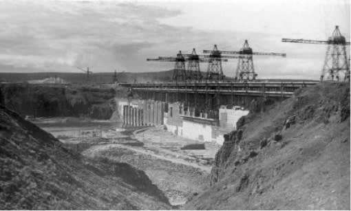 Стиснутая диабазовыми стенами, шумно и мощно неслась аквамариновая вода. Изредка у берегов всплёскивала рыбёшка, спасаясь от прожорливого окуня. Здесь сегодня над водой повисли хвосты дыма и пыли, распластались дамбы вплоть до самой середины реки. По дамбам идут самосвалы, стучат топоры. Льётся мутным потоком пульпа. Громко переговариваются и шутят шофёры, выйдя на минутку из машины, чтобы попить кваса у киоска, что стоит на самой серёдке Ангары.