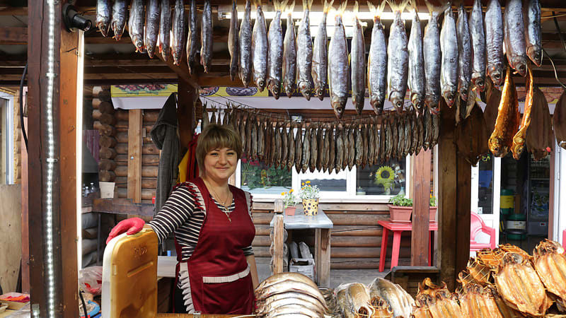 В глубине рядов, где чуть потише, в процессе неспешной дегустации мы разговорились с одной из продавщиц, Татьяной. Омуль, говорит она, есть любой – холодного и горячего копчения, малосольный. Есть хариус, есть сиг, вся рыба местная. Рассказывает, что сейчас им привозят рыбу из Северобайкальска – в Листвянке своя рыба будет только в августе.