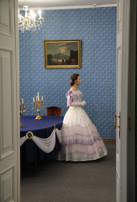 К открытию выставки, посвящённой Елене Волконской, в музее подготовились основательно. На входе гостей встречала заведующая отделом Дома-музея Волконского Антонина Афанасьева в красивом платье XIX века. Специально к открытию выставки сотрудники музея создали платье точь-в-точь такое же, какое когда-то было у самой Елены Волконской – купленное во Франции и подаренное ей братом Михаилом в 1856 году со словами: «Для своей любимой и единственной сестры, чтобы Нелли была в нём на коронационных торжествах». Он писал: «Вы, конечно, можете найти более красивое платье и более удачное, чем нашел я, но единственное, в чём я уверен, что Нелли в этом платье будет самая красивая».
