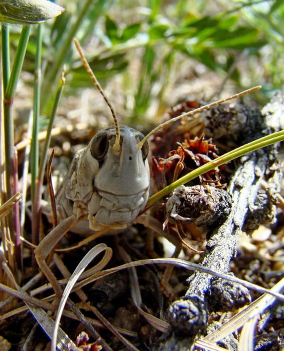 Кузнечик серенький сидит на сером камне молча, неподвижно. Мой однофамилец, можно сказать. Но я прошёл мимо. Поснимал его собратьев разных в траве и одного большого и страшного просто на голой земле. Возвращаюсь, а он сидит. Медитирует. Философ, наверное. Сел и я рядом. Он недовольно отодвинулся подальше. Именно отодвинулся, не отпрыгнул. Сидим вместе. Молчим. Он думает. Я курю. Потом присмотрелся я, а кузнечик не только сам на камень похож, у него от долгих размышлений даже глаза будто каменными стали. Серые, в светлую крапинку. Фотографирую его с разных сторон – никакой реакции. Закончив фотосессию, решил проверить, жив ли он вообще или это миниатюрный каменный памятник на каменном постаменте. Хотел пальцем потрогать, и вот это оказалось для кузнечика последней каплей, после которой его долготерпение лопнуло. Отпрыгнул он далеко-далеко, на острую вершину крупного камня и оттуда такое прострекотал, что мне до сих пор стыдно за сорванную медитацию.