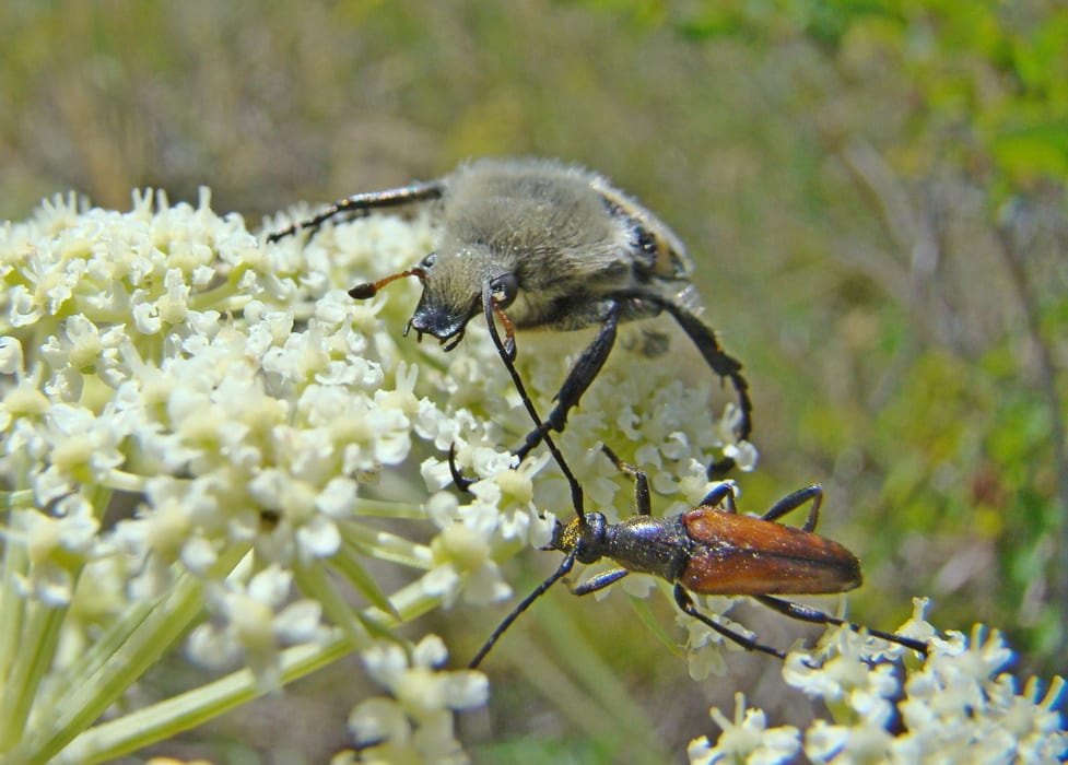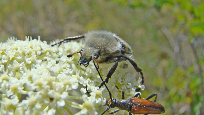 Крупные чёрные муравьи фотографироваться не любят. Хотя один бравый вояка, потерявший ус в былых сражениях, мне позировал даже верхом на страшном жуке. А ещё одна молодая муравьиная дамочка – на цветке… Правда, это исключения. А чаще они вид делают, будто им некогда. Что они жуть как заняты хлопотами о родной семье. Не верьте. Притворяются. Это рыжие лесные муравьи – те трудяги. А чёрные – так, больше пыль в глаза пускают, чем работают. Я понаблюдал за одним таким качком лысо-бритым. Выскочил он из норки земляной возле камешка и давай туда-сюда перед объективом бегать. И по камешку, и под камешком. Ну прямо как некоторые люди – ни секунды покоя. Бегал-бегал, суетился, создавал видимость бурной деятельности – да так пустым и вернулся в норку. Ни хвоинки, ни травинки, ни зёрнышка завалящего, ни козявки какой-нибудь не принёс семье. Впрочем…Может быть, он наёмным секьюрити служит, потому и бегал перед объективом специально, чтобы показать, что жилище под надёжной охраной. Если так, то ладно.