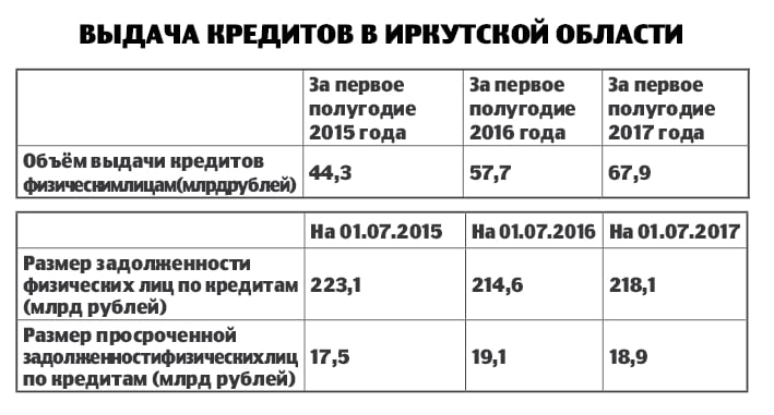 Если говорить об абсолютных цифрах, по данным Банка России (на 1 июля нынешнего года), наши земляки задолжали банкам более 218 миллиардов рублей. Из этой суммы около 19 миллиардов – просроченные кредиты. Для сравнения: годовой бюджет Иркутской области составляет примерно 100 миллиардов рублей.