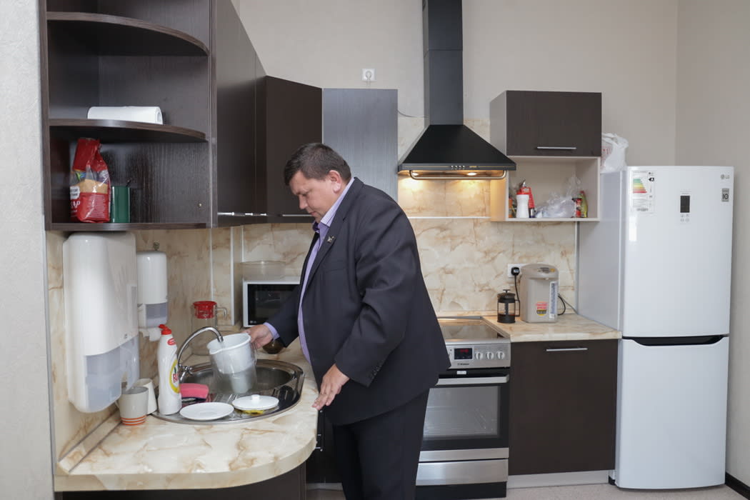 Царство высоких технологий заканчивается, когда за нами практически бесшумно закрывается дверь на магнитном замке. Раздевалка для диспетчеров – ряд серых металлических шкафчиков, на которых красуются таблички с именами их владельцев. Рядом туалет с душевой кабиной. В следующей комнате располагается кухня. Плита с вытяжкой, чайник и холодильник создают впечатление домашнего уюта. Но его всё-таки нарушает рабочий разговор по мобильному, который ведёт вышедший на обед дежурный инженер оперативного планирования Константин Буртушкин. Видимо, такова одна из причин, по которым те, кто находится на смене, стараются затратить на приём пищи как можно меньше времени.