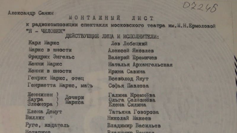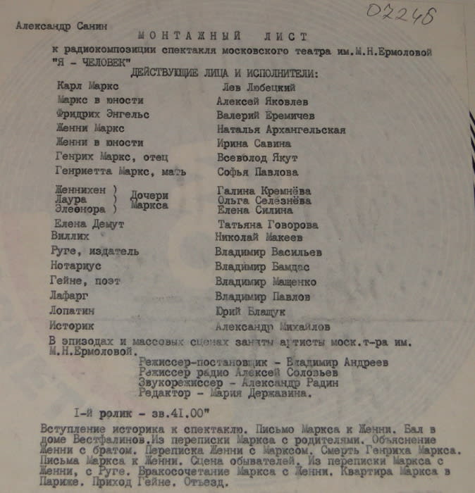 «После ряда написанных со знанием дела, но нигде не поставленных пьес ему вдруг повезло. Благодаря сплетению обстоятельств главному режиссёру театра имени Ермоловой Андрееву понадобилась пьеса о Марксе. Эта пьеса А. Санина «Я – человек!» давно лежала в портфеле у завлита Елены Якушкиной (той самой Елены Якушкиной, которую Вампилов называл «старшей сестрой», поскольку она тоже помогала в его мытарствах по столичным чиновничьим кабинетам и театрам. – В.Х.). Она показала пьесу Андрееву. Тот принял её и начал работать. Спектакль получился… Высокоэмоциональный спектакль… Название пьесы полностью оправданно! Режиссёр В. Андреев получил первую премию на Всесоюзном театральном фестивале к 110-летию со дня рождения Ленина. Он же стал лауреатом Государственной премии РСФСР за три спектакля, поставленных им в своём театре, в том числе за спектакль о Марксе (первые два по Распутину и пьесе Вампилова – неплохая компания)».