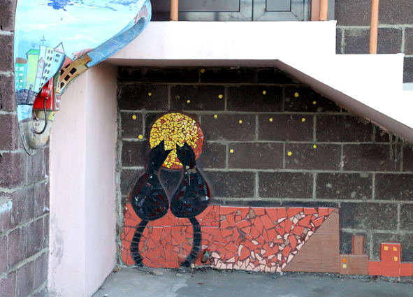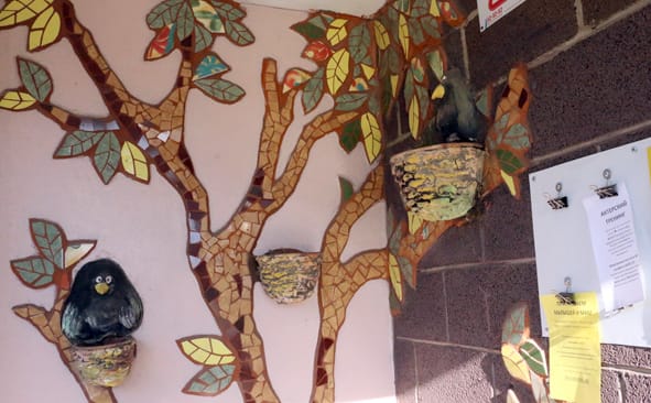 Главное украшение двора – мозаика на фасадах домов. Мотивы разные: огромное солнце как символ тепла и радости, уютные домики с ветряными мельницами. Эти картины Наталья делала вместе со своими подопечными из школы дизайна. В создании солнца участвовали даже совсем маленькие художники. По словам Натальи, выбор в пользу такой техники не случаен: мозаика износостойкая, ей не страшны перепады температур, её детали не смогут отколупать даже самые настойчивые непоседы.