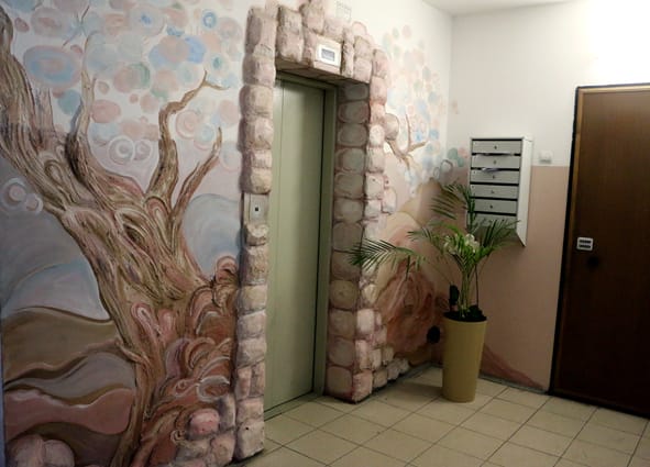 Все работы в подвале оплачиваются по статье «Текущий ремонт». По словам Светланы Юрьевны, из этих же денег жильцы соседних домов установили дополнительное оборудование на детские площадки. По этой же статье оплачивалась роспись в подъездах. Сегодня лестничные площадки дома № 13 заслуживают отдельного внимания. Каждый этаж расписан по-разному, рисунки и их цветовую гамму согласовывали с жильцами квартир. Самая большая роспись на первом этаже: лифт словно ведёт к розовому побережью, напротив – цветут лилии, а чуть дальше семейство цапель гуляет на болоте.