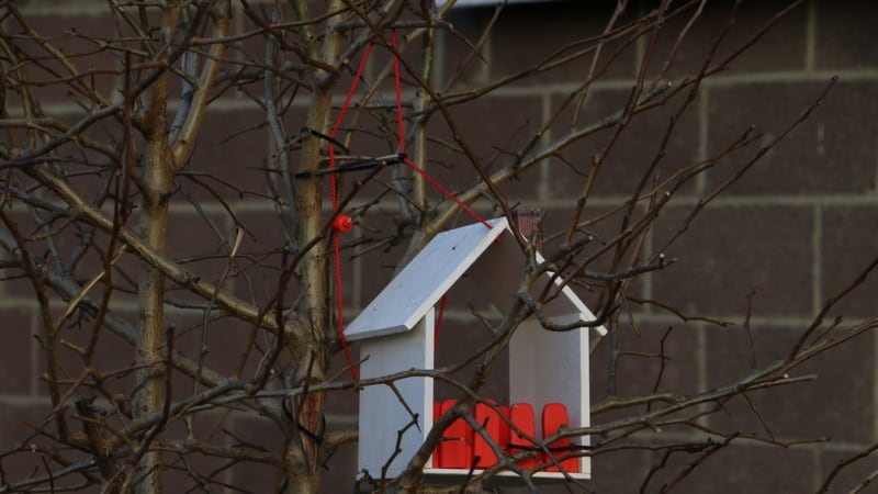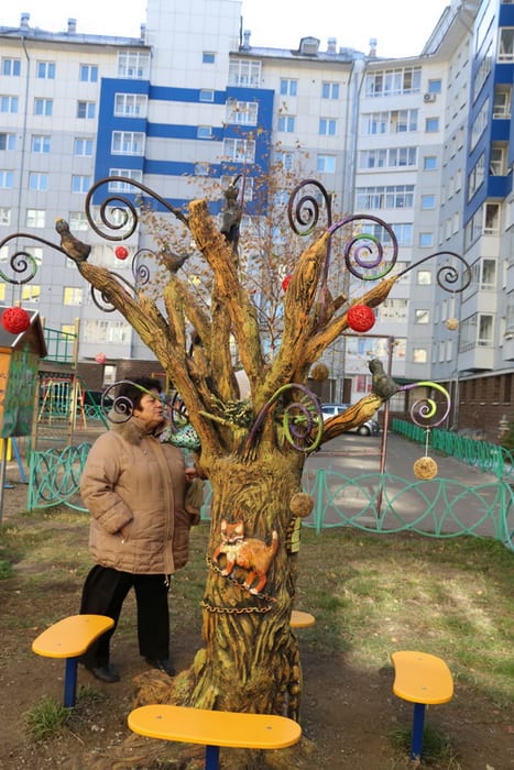 Заходим за угол дома № 11, и глаза разбегаются: кажется, что весь двор усыпан рукотворными деталями. Первым делом Наталья ведёт нас к недавно появившемуся «Дереву желаний» – его установили в сентябре. Вопреки названию в нём легко угадывается дуб из Лукоморья: на нём и русалка сидит, и кот вышагивает по золотой цепи.