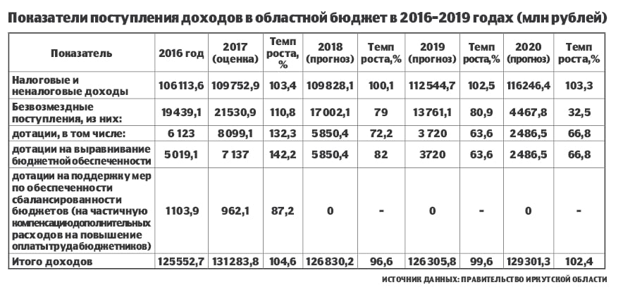 С нового года Приангарье лишится значительной части поддержки из федерального бюджета (см. таблицу), которая в течение трёх ближайших лет сократится до 2,5 млрд против 7,1 млрд в 2017 году. Из хорошего – поступления от налогоплательщиков, зачисляемые в региональную казну, растут: в 2016 году они составляли 106,1 млрд, в 2017-м ожидаются в объёме 109,1 млрд, а в 2018-м – 109,8 мдрд.
