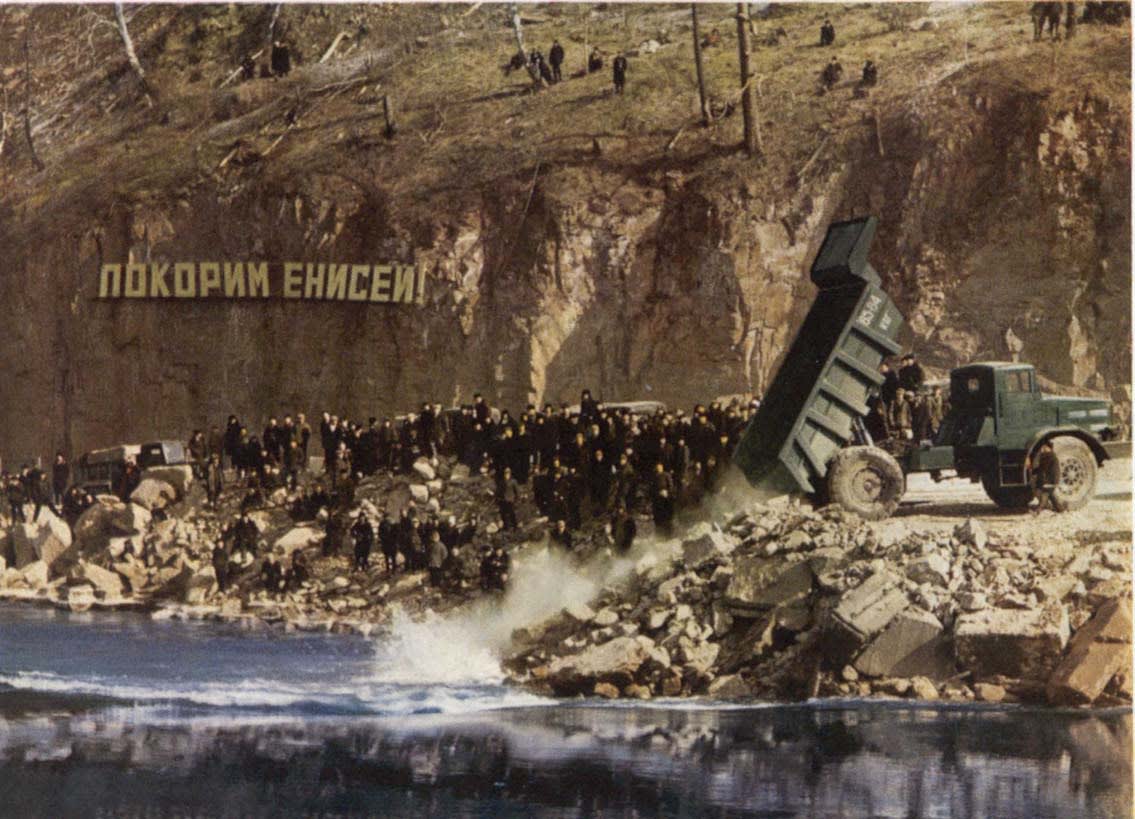 В период с 1955-го по 1972 год многотысячный коллектив «КрасноярскГЭСстроя» проявлял настоящий героизм, выходя на поединок с сибирской рекой. Спустя три года после начала строительства в её русло сбросили первую гранитную плиту со смелой надписью «Покорись, Енисей!». С этого момента развернулось основное строительство гидростанции в правобережном котловане. На красноярской стройке побывал и первый космонавт. Как почётный член бригады бетонщиков-гидростроителей Юрий Гагарин получил собственную лопату, а затем сфотографировался со своей бригадой.