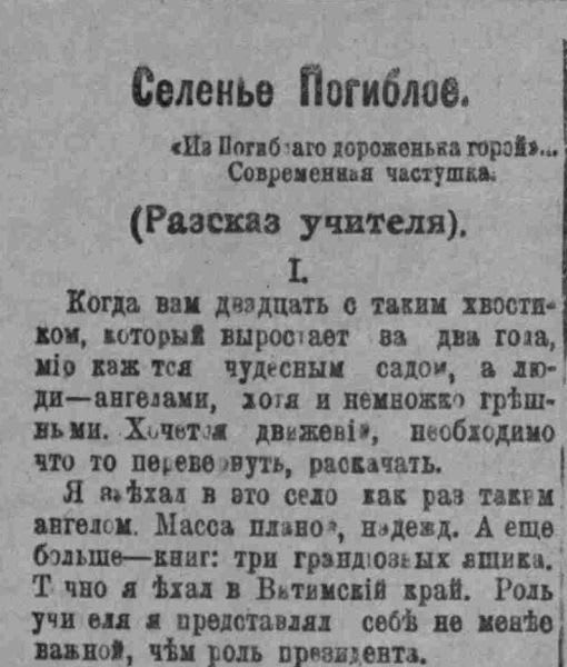 Но теперь стало интересно, а что же ещё писал Титов в 1918-1919 годах в «Наше дело»? Я начала листать архив повторно, теперь сосредоточившись на фамилии Титов. Оказалось, он печатался и под полной фамилией. Весной 1919 года в «Нашем деле» был опубликован большой рассказ «Старик Назар». Потом был перерыв, Титов по-видимому, освещал работу съезда учителей. А осенью 1919 года этнограф, покончив со школьными и экспедиционными делами, активно занялся и иркутским литературным миром. В годовщину смерти Дмитрия Олерона по просьбе Елпидифора Титова «Наше дело» напечатало два стихотворения покойного. В следующем номере Титов разместил текст о судьбе Дмитрия Глушкова и подписался полной фамилией, так что в этом случае сомнений в авторстве не было. И в это же время под его полной фамилией выходит в двух номерах «Нашего дела» рассказ «Сухостой». Однако оставались ещё газеты за 1918 год. И вот в ноябрьском номере за 1918 год я увидела рассказ «Селенье Погиблое», подпись была смазана, однако по контексту стало понятно: пишет очень молодой сельский учитель, которому «двадцать с хвостиком» лет, приехавший в село поднимать школу. Не осталось сомнений, что смазанная подпись под текстом – «Е.Т.». Писал Елпидифор Титов.