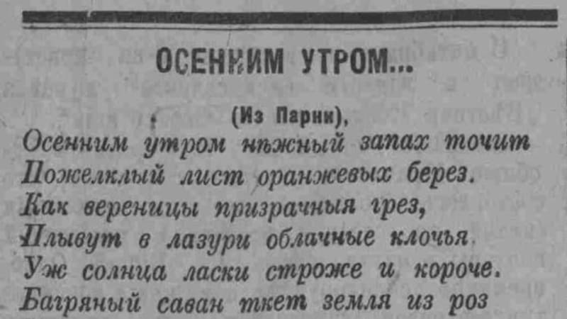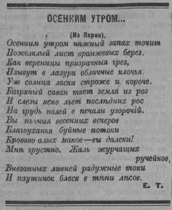Осенью 1919 года в «Нашем деле» было опубликовано стихотворение «Осенним утром. Из Парни», подписанное «Е.Т.». Сам по себе перевод произведения Эвариста Парни говорит о том, что человек был хорошо знаком с отечественной и зарубежной литературой, ведь Парни был кумиром юного Пушкина, мастером элегии. Его переводили и Батюшков, и Баратынский… Анна Ахматова посвятила Пушкину стихотворение, в котором были такие строки: «Здесь лежала его треуголка и растрёпанный том Парни…» Но одно дело – увлекаться элегиями Парни в переводах, а другое – решиться на собственный перевод. Значит, человек неплохо владел французским. Но кто это? Мужчина, женщина? Единственное, что могло помочь, это очень утомительный и скучный просмотр газет хотя бы за один 1919 год по номерам. На такие эксперименты иногда уходит по 3-4 дня, однако они почти всегда заканчиваются интересными находками. Расчёт был простой: вдруг загадочный «Е.Т.» писал в газеты ещё что-то, кроме стихов. Ведь известно, что Андриан Голянковский, к примеру, и печатал свои стихи как поэт, и служил журналистом. Похожая журналистская судьба была у Дмитрия Олерона. Теплилась надежда, что «Е.Т.» тоже из круга иркутских литераторов и обнаружит себя как журналист. Нужно было искать похожие инициалы среди газетных статей, а уже по их тематике пытаться понять, что интересовало человека, чем он занимался…