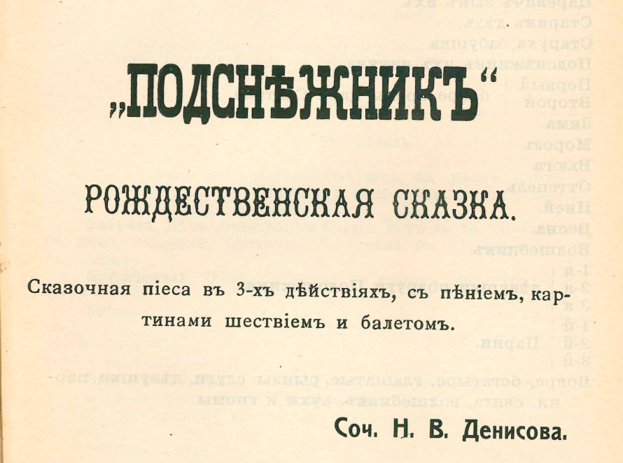 Изобретательность и творческая энергия устроителей ёлочных праздников в Иркутске были такими мощными, что к Рождеству отдельные учебные заведения брались за постановку пьес собственного сочинения. Во 2-й женской гимназии имени И.С. Хаминова несколько лет подряд рождественские спектакли ставились по пьесам, сочинённым российским театральным художником Николаем Васильевичем Денисовым. Денисов прибыл в Иркутск в 1888 году, преподавал рисование, черчение и чистописание в иркутских женских гимназиях, ремесленно-воспитательном заведении Трапезникова, Сиропитательном доме Медведниковой. Работал художником-декоратором в городском театре. Несколько раз, в 1895-м и в 1905-м, покидал Иркутск, но снова возвращался. В очередной свой иркутский период – с 1900-го по 1905 год – он и сочинил пьесы для нескольких рождественских спектаклей второй женской гимназии. Эти спектакли вызвали живой отклик зрителей, их сюжеты подробно описывались в новогодней прессе. «Не раз нам приходилось слышать сожаление, что пьески репертуара 2-й гимназии не издаются особым сборником, – писали газеты. – Такой сборник – с приложением нот, подробных указаний режиссёрского характера – был бы ценным вкладом в детскую литературу». Сборник пьес Денисова действительно вышел – с цветными иллюстрациями, эскизами декораций к рождественским спектаклям. Сейчас сказочные пьесы, впервые поставленные в Иркутске, можно найти в редких фондах российских библиотек. И если у кого-то возникнет желание, можно поставить новогоднюю пьесу именно так, как ставили её в Хаминовской гимназии около сотни лет назад.