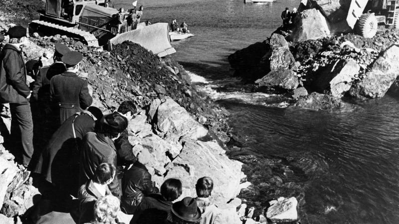 В 17.30 перекрытие, как и было запланировано, завершилось. Прежде чем пошла песчано-гравийная смесь, последнюю глыбу бросил Назимко. «Берега сомкнулись, – заканчивал Бочкин очередной эпизод из своей автобиографии. – Справа образовалась запруда, а слева за бетонной гребёнкой гремел водопад. Вот уже бульдозер наехал на границу двух только что сомкнувшихся насыпей. Вода ещё пыталась прорваться между грудами крупных камней, а люди по острым, пока неустойчивым каменным глыбам бежали навстречу с правого и левого берега, хватали друг друга за плечи. И среди молодёжи на вздрагивающих, как это подметил в своём очерке Борис Полевой, камнях стояли два грузных, очень немолодых человека – начальник управления левого берега Горлов и начальник управления правого берега Сычов. Они долго держали друг друга за руки, забыв, что находятся под обстрелом фотоаппаратов и кинокамер».