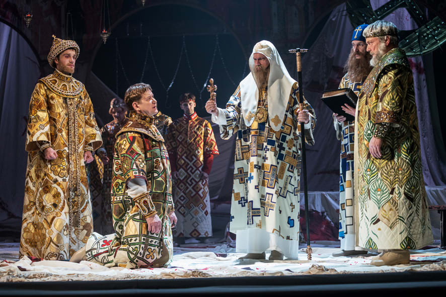 В центре пьесы и в постановке, несомненно, два ярких и колоритных образа – Борис Годунов и князь Василий Шуйский. Драматург Алексей Толстой в своём «Проекте постановки на сцену трагедии «Царь Фёдор Иоаннович» так оценивал Бориса Годунова: «Как ни жестоки его меры, зритель должен видеть, что они внушены ему не одним только честолюбием, но и более благородной целью, благом всей земли, и если не простить ему приговора Дмитрия, то понять, что Дмитрий есть действительное препятствие к достижению этой цели». Заслуженный артист России Степан Догадин сразу же привлекает зрителя своей убеждённостью, исторической справедливостью и решительностью в борьбе с Шуйскими. Годунов Догадина и внешне привлекателен, обаянием и интонационной красотой, безусловно, окрашивая создаваемый образ будущего царя России, что ярко и убедительно предвосхищает перемещение в финале шапки Мономаха.