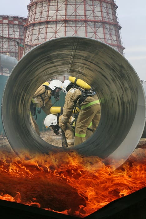 Следующий элемент – галерея с имитацией ленточного конвейера. Пожарные должны подняться и потушить возгорание при абсолютном задымлении, обнаружить пострадавшего и спустить его с высоты 5 метров. Заключительный этап – прохождение по трапу над приямком с горящей жидкостью и её тушение. В будущем полосу препятствий пожарные планируют дополнить ещё одним снарядом – для отработки тушения электроустановок под напряжением. В целом протяжённость огневой психологической полосы составляет 150 метров.