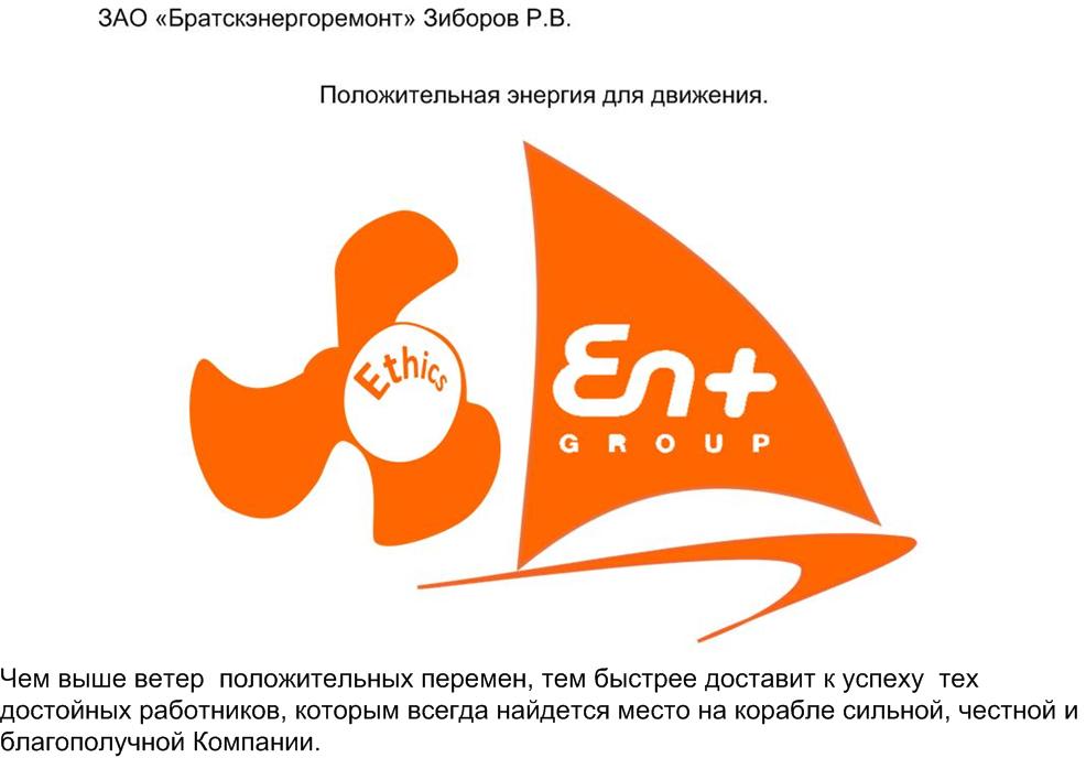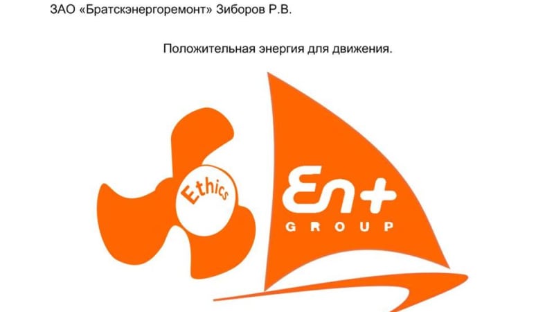 Визуализацию ценности представил уполномоченный по этике – инженер АО «Братскэнергоремонт» Андрей Базанов. На логотипе ветер подгоняет парусник с эмблемой En+. Ветер изображён в виде большого винта, в основании лопастей которого – этика. «Чем выше ветер положительных перемен, тем быстрее он доставит к успеху тех достойных работников, которым всегда найдётся место на корабле сильной, честной и благополучной компании», – так автор логотипа объяснил символику. По его словам, идея логотипа принадлежит не ему одному. Над рисунком работали целой командой.