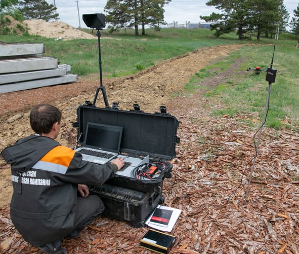Сборкой подготовка к вылету не ограничивается. Необходимо ещё смонтировать камеры, установить на воткнутом в землю алюминиевом шесте передатчик, разложить штатив с экраном. Остаётся, наконец, включить ноутбук, играющий роль пункта управления. Он нужен для предполётной подготовки.