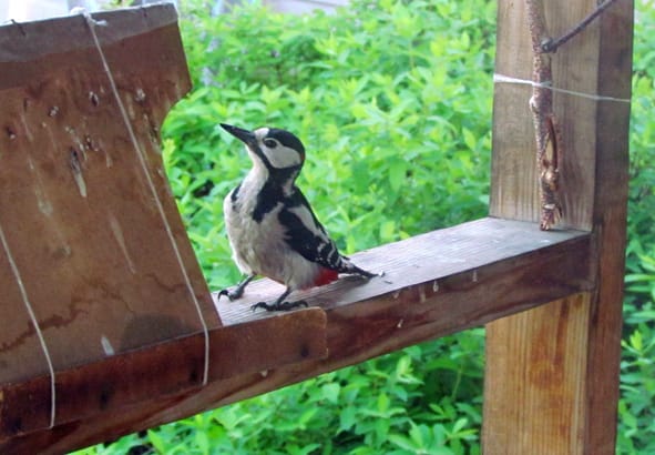 Старый приятель – дятел – в очередной раз навестил меня. Именно в эту пору, в мае–июне, он прилетает ко мне на завтрак практически каждое утро, гораздо чаще, чем даже в голодное зимнее время. А с июля до самых снегов и морозов и вовсе редким гостем станет. Другое дело – конец весны и начало лета. Причина в том, что как раз сейчас они с подругой (большой пёстрый дятел – птица моногамная, семью создаёт не на один год) птенцов выкармливают. Они из яиц вылупляются голыми, слепыми и в первые дни совсем беспомощными. Но едят как большие. Требуют исключительно животную пищу. Семена, даже самые вкусные, сосновые, есть не умеют и не хотят. Таскают им родители всяких гусениц, жучков, червяков от рассвета до заката без продыха, а самим и перекусить некогда. Вот и прилетают к кормушке – перехватить хотя бы семечек подсолнечных да хлебушка белого городского, раскрошенного и подсушенного, чтобы сил хватило на добычу «мяса» ненасытному потомству.