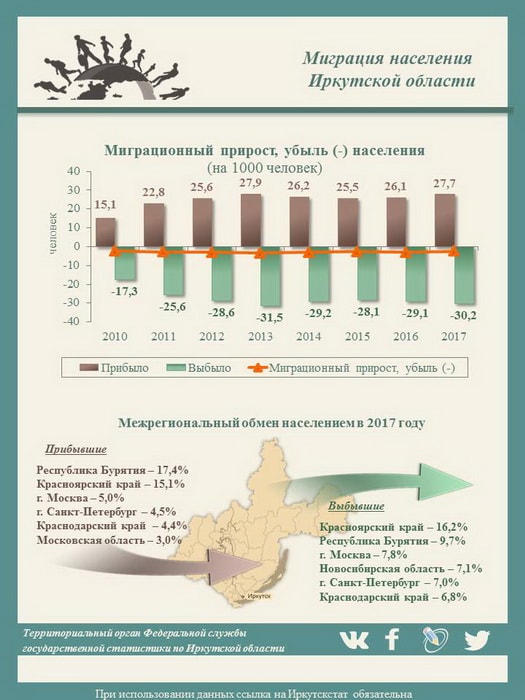 За анализируемый период (2010–2017 годы) стабильный миграционный прирост в обмене населением был отмечен только с Республикой Бурятия и Забайкальским краем, с Республикой Тыва – в 2010–2015 годах. Жители этих регионов, а также Дальнего Востока выбирают Иркутскую область в основном для получения высшего и среднего профессионального образования. После завершения обучения граждане закрепляются на предприятиях Приангарья и, как следствие, остаются на постоянное жительство.