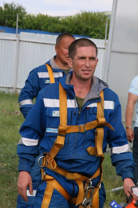 Ещё один этап – практическое испытание. Электромонтёры должны устранить обрыв провода, а перед этим заземлить его, чтобы в первую очередь обезопасить себя. «Мы, энергетики, все семейные люди, нас всех ждут дома, – говорит Валерий Казанцев. – После того, как провод обесточили, его опустят и приступят к ремонту». В каждой команде есть мастер, который выписывает наряд, в нём указывает всё, что надо отключить, какие меры безопасности принять. Также есть производитель работ, который подготавливает рабочее место. После проведённого инструктажа и проверки удостоверений каждый участник команды должен найти место повреждения провода и устранить этот порыв.