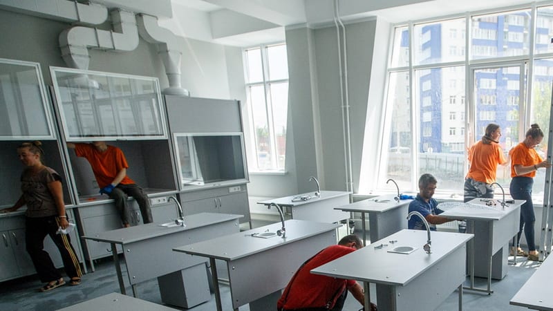 На строительной площадке полностью готовы учебные блоки, в классах установлены меловые и проекционные доски. Ведутся генеральная уборка помещений, установка оборудования в столовой и в специализированных кабинетах химии, физики, завершается монтаж пяти лифтов. В холлах на стены наносят тематические рисунки. В актовом зале и зале для проведения форумов устанавливают кресла. В спортивном блоке уже проведены гидравлические испытания чаш бассейна. Помещения предусмотрены для пользования маломобильными школьниками. На завершающем этапе находится обустройство планетария.