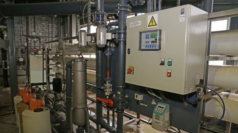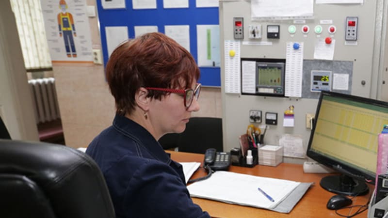 «Аппаратчики считаются оперативным персоналом, они работают под руководством начальника смены котлотурбинного цеха, – замечает Шестаков. – Мы осуществляем, будем так говорить, методическое руководство». Насосы, фильтры и установки обратного осмоса работают в автоматическом режиме. Техника следит за уровнем в баках химически очищенной воды и, как только он приближается к 35%, включает оборудование. В то же время аппаратчик может задействовать его вручную, отдав команду со своего рабочего места через экран ПЛК – программируемого логического контроллера. На том же сенсорном дисплее отображается и режим работы оборудования для очистки воды. Подобными экранами оборудованы и сами установки.