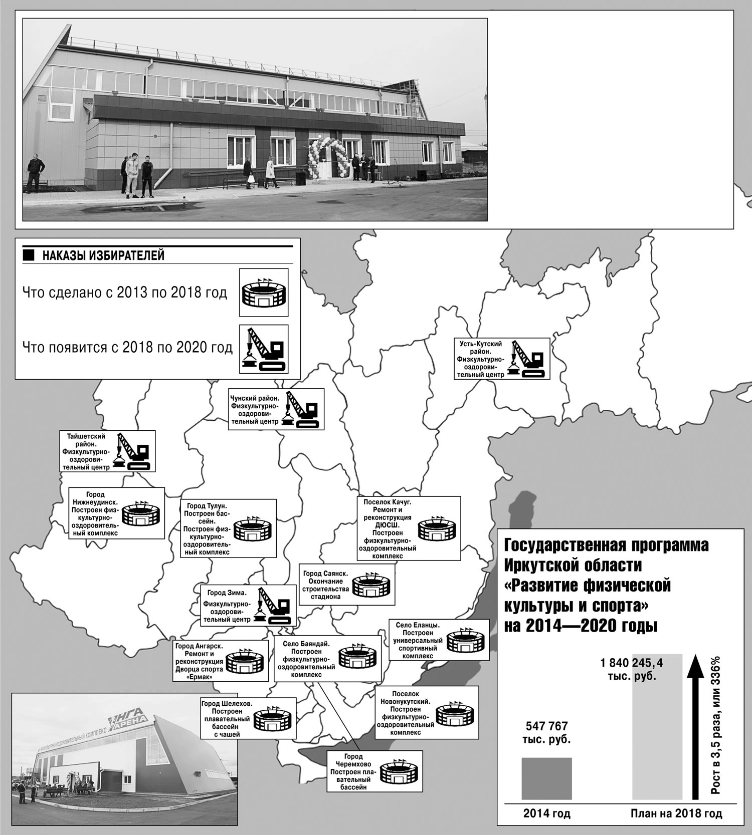 Три года назад Законодательным Собранием Иркутской области был взят курс на обновление спортивной инфраструктуры в регионе. Сегодня в крупных городах строятся многофункциональные спортивные центры, в поселениях – физкультурно-оздоровительные комплексы. Кроме того, в сельских территориях реализуется проект по строительству спортзалов в школах, выделяются деньги на покупку спортинвентаря.