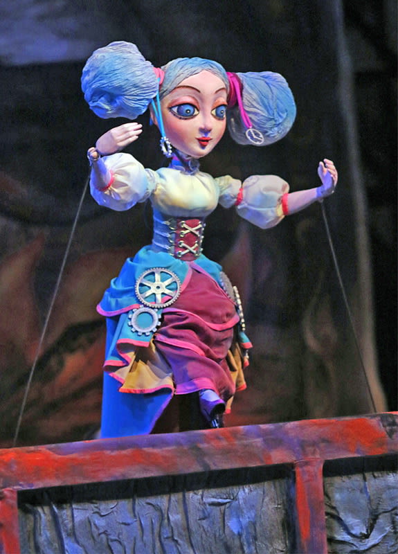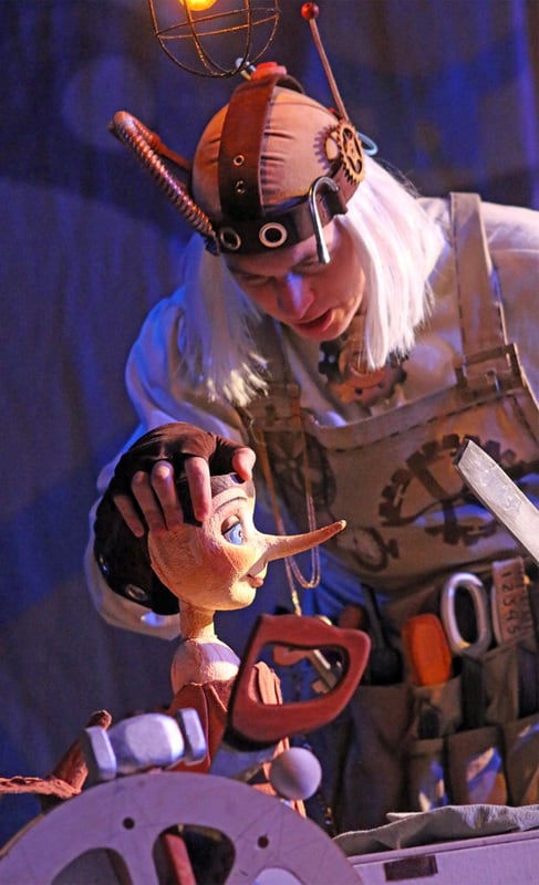 – Нам хотелось поэкспериментировать, соединить разные системы кукол, – рассказал главный режиссёр театра Юрий Уткин. – В действии заняты трюковые, ростовые куклы, тантамарески, тростевые, планшетные куклы и живые актёры. Сказка разноплановая: там есть персонажи-куклы, персонажи-люди, животные. Это совершенно разные миры, и хотелось каким-то образом показать, что они и визуально все разные, и воплощения их разные. Хотелось с ребёнком поговорить о самом важном: кто ты? Настоящий – или марионетка в чужих руках? Нас всю жизнь воспитывают, и дай бог, если от воспитания человек становится личностью. А если марионеткой? Поэтому мы бы хотели, чтобы ребёнок с детства понимал, что всё зависит от него, его поступков. Поэтому Буратино у нас должен принимать решения сам, когда перед ним стоит сложный выбор. Для того времени, когда писалась книга «Буратино», было важно, что Папа Карло – бедный человек, вынужденный тяжёлым трудом зарабатывать на жизнь. Мне сейчас важнее поднять тему творца. Папа Карло у нас настоящий мастер – мастер кукол. Для него важна не цена за куклу, а то, какой она будет, что будет уметь. А потом он видит, что Карабас переделывает кукол и они превращаются, грубо говоря, в сценических чудовищ. И он жалеет, что вынужден делать кукол для такой сцены. Нам не принципиально сейчас говорить о нищете человеческой, мы говорим о нищете духовной. Мы не можем просто переносить литературу на сцену, мы должны поднимать какие-то другие подтексты. Когда ты на ночь читаешь ребёнку сказку, у него работает воображение. А когда он приходит к нам, хотелось бы, чтобы он отправился с нами в зримое путешествие.
