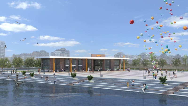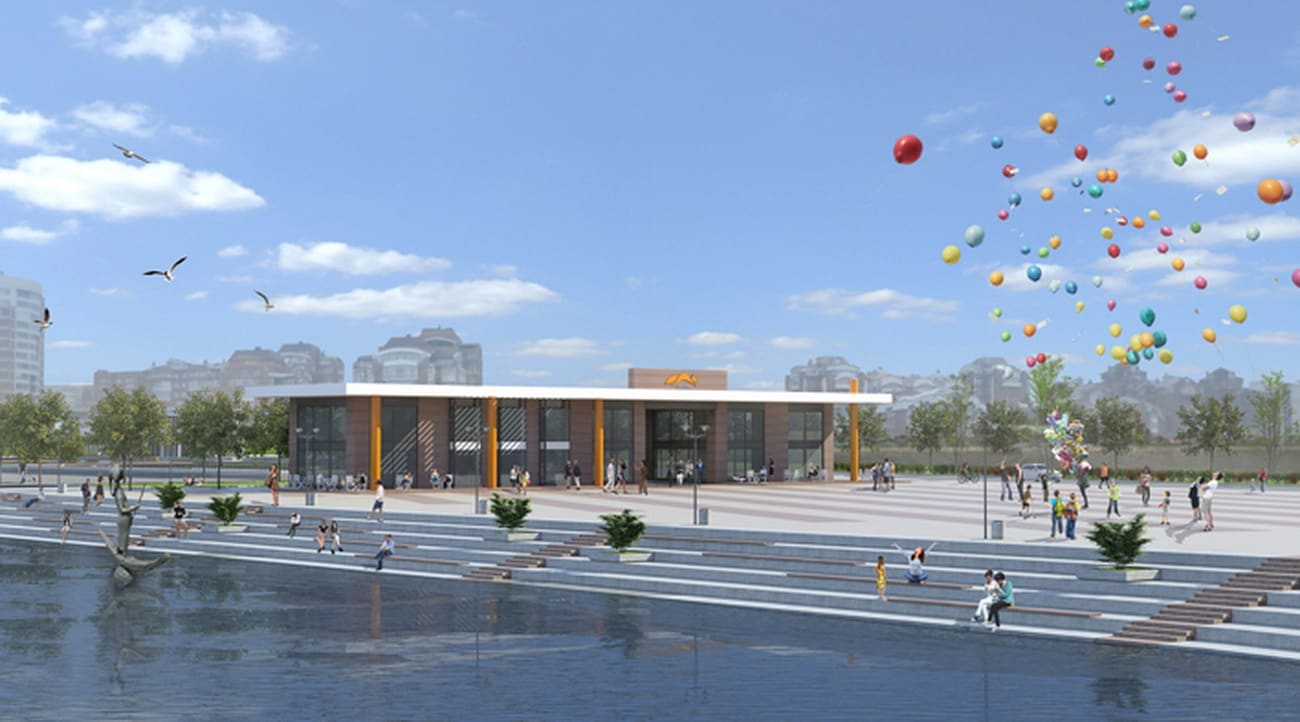 Существующий сегодня участок – это пляжная зона. Та часть набережной, для которой есть готовый проект благоустройства, протянется практически до пристани «Ракета». Здесь, на полукруглой стрелке «полуострова», на котором находится микрорайон, разместится её центральная площадь с амфитеатром и выставочным залом. На участке между ней и ледоколом разместятся площади со скульптурами «Знаки зодиака», «Мостик влюблённых» протянется на маленькую смотровую площадку на воде, будут кафе, детская площадка.