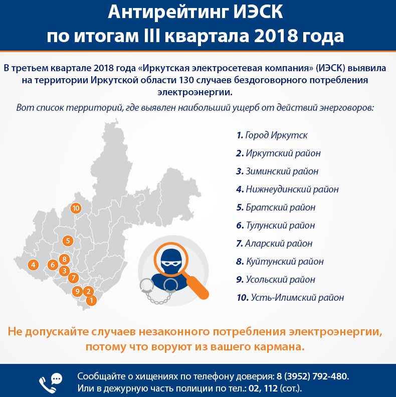 Казалось бы, угроза наказания должна дисциплинировать потребителей. Но на некоторых – немногих, к счастью, – она особо не действует. Так, только в третьем квартале 2018 года в Иркутской электросетевой компании выявили 130 случаев бездоговорного потребления энергии. Ущерб от них превысил 7,5 млн рублей. В очередном рейтинге, составленном в ИЭСК, как и три месяца назад, лидирует Иркутск. Финансовый ущерб от действий «похитителей» электричества, выявленных в городе, составил 3,2 млн рублей. На втором месте находится Иркутский район с показателем 2,1 млн рублей. Тройку «лидеров» замыкает Зиминский район, в котором мимо «кассы» энергетиков ушло 583 000 рублей. В десятку также входят – в порядке убывания финансового ущерба – Нижнеудинский, Братский, Тулунский, Аларский, Куйтунский, Усольский и Усть-Илимский районы.