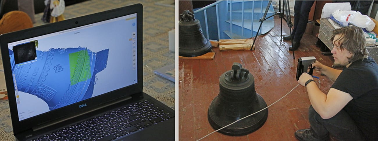 С помощью 3D-сканера участники проекта снимают с колоколов полную геометрию. Сканер делает тысячи фотографий колокола с разных ракурсов. А потом компьютерная программа складывает их все в одну объёмную картинку. Но мелкие элементы декора, узор литья сканируются недостаточно хорошо. Поэтому орнаменты «копируют» при помощи обычного скульптурного пластилина.