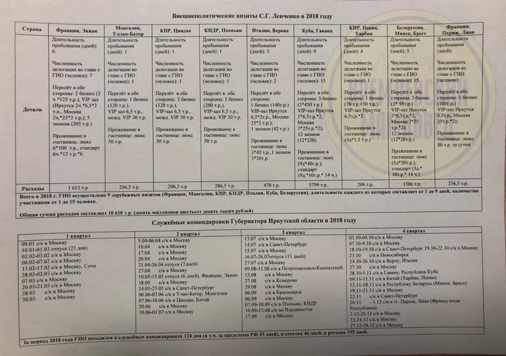 124 из 365 дней в 2018 году губернатор Иркутской области Сергей Левченко провёл в служебных командировках за пределами региона. Больше месяца, а именно 35 дней вообще находился за границей. На путешествия он потратил более 10,6 млн. рублей. Глава области побывал в КНДР, на Кубе, во Франции, в Италии, в Китае. Каждый раз поездка «обставлялась» уверениями, что будут заключены соглашения о сотрудничестве, и в регион хлынут инвестиционные потоки. Однако ни один визит не закончился ни одной реально заключённой сделкой, или контрактами. 2019 год глава области начал точно так же: губернатор снова не в Иркутской области. В эти дни он в Сочи, на Инвестиционном форуме. И эта поездка, очевидно, не принесёт области ничего, кроме бюджетных расходов.