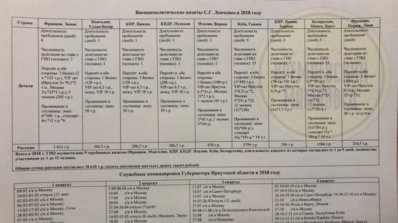 124 из 365 дней в 2018 году губернатор Иркутской области Сергей Левченко провёл в служебных командировках за пределами региона. Больше месяца, а именно 35 дней вообще находился за границей. На путешествия он потратил более 10,6 млн. рублей. Глава области побывал в КНДР, на Кубе, во Франции, в Италии, в Китае. Каждый раз поездка «обставлялась» уверениями, что будут заключены соглашения о сотрудничестве, и в регион хлынут инвестиционные потоки. Однако ни один визит не закончился ни одной реально заключённой сделкой, или контрактами. 2019 год глава области начал точно так же: губернатор снова не в Иркутской области. В эти дни он в Сочи, на Инвестиционном форуме. И эта поездка, очевидно, не принесёт области ничего, кроме бюджетных расходов.