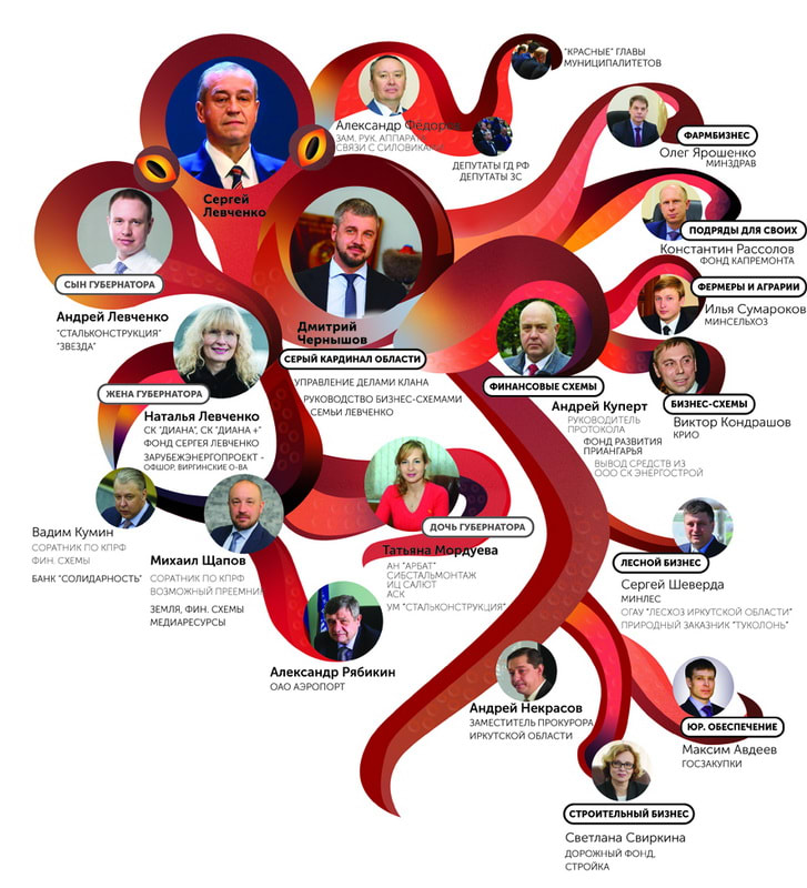 Весь политико-экономический клан Левченко можно условно разделить на три «щупальца», каждое из которых обшаривает Иркутскую область в поисках «новых возможностей». Между собой они то тесно переплетаются, то конкурируют, но исправно вносят свой вклад в общее обогащение.