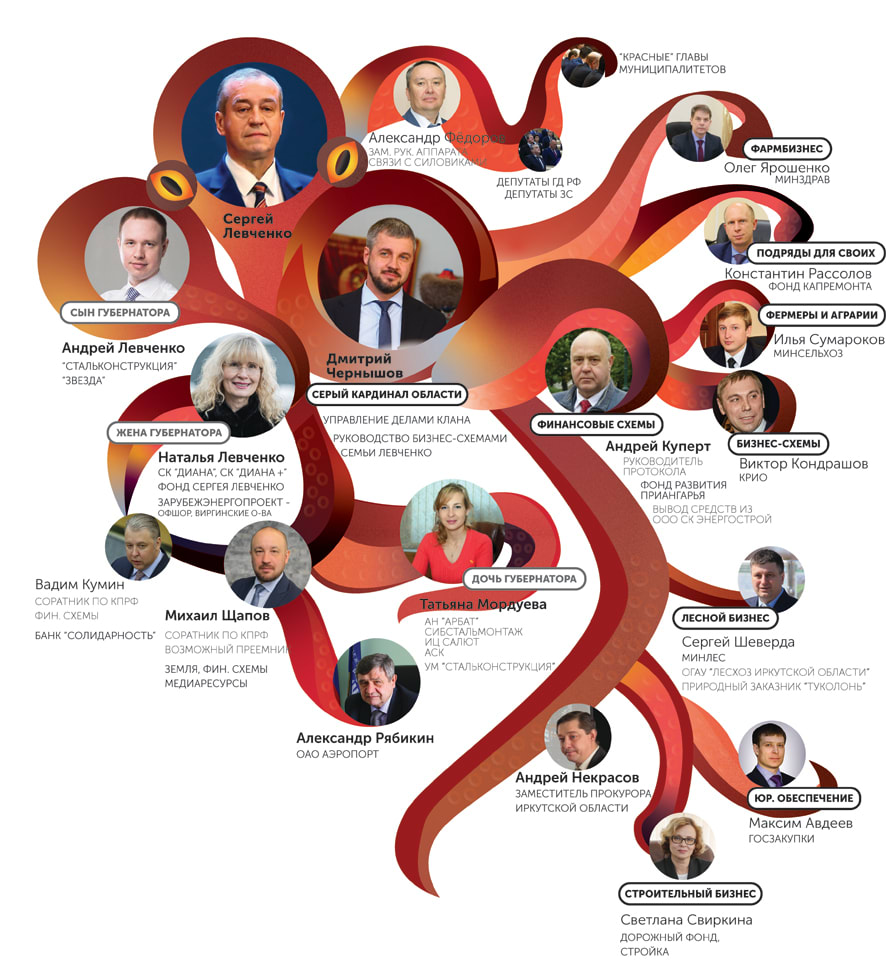 Весь политико-экономический клан Левченко можно условно разделить на три «щупальца», каждое из которых обшаривает Иркутскую область в поисках «новых возможностей». Между собой они то тесно переплетаются, то конкурируют, но исправно вносят свой вклад в общее обогащение.