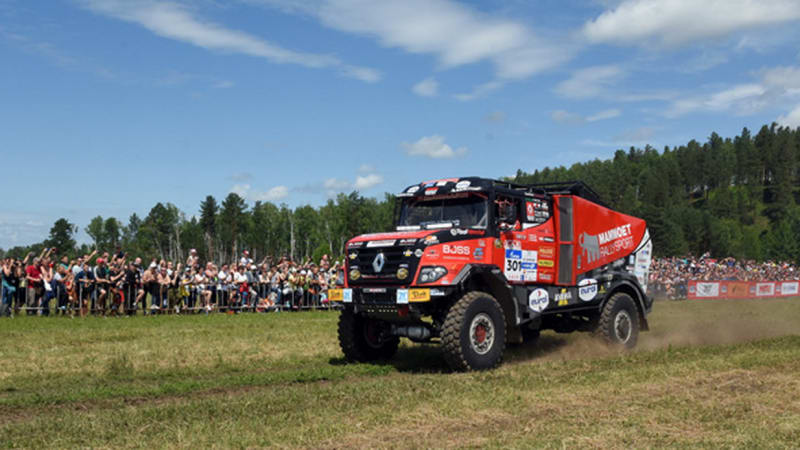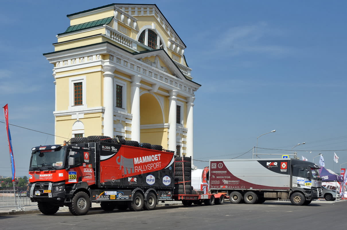 Тем временем солнце постепенно поднимается, подсушивая трассу. Стартующие после мотоциклов четырёхколёсные машины, особенно багги с задним приводом, ещё разбрасывают комья грязи при разгоне. Грузовики поднимают разве что пыль. Но этот недостаток они с лихвой компенсируют громким рычанием двигателей и мощным выхлопом – любой, кому довелось постоять даже за ограждением вдоль трассы, подтвердит, что земля под ними в буквальном смысле сотрясается. Первым на маршрут выходит экипаж Андрея Каргинова, Андрея Мокеева и Ивана Малкова – машина «КамАЗ-мастер» под номером 300. Следом стартуют Мартин ван ден Бринк и Ваутер де Грааф. Механик их экипажа – 17-летний Митчелл ван ден Бринк, сын Мартина. Тройку замыкает машина Айрата Мардеева, ещё одного представителя «КамАЗ-мастера», имеющего в активе победу в «Дакаре».