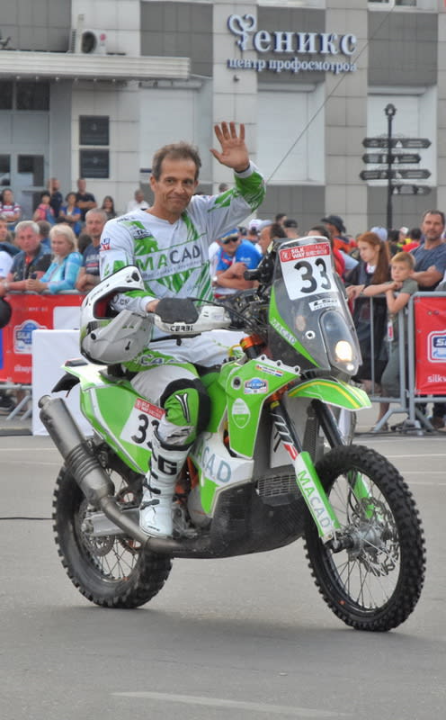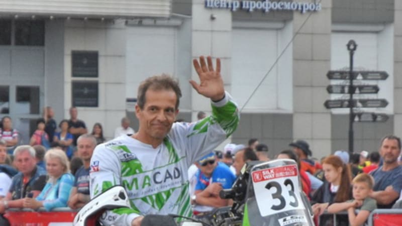 – Можете меня сфотографировать? – на английском обращается к проходящим мимо растяжки с логотипом ралли жилистый мужчина среднего роста, который держит в одной руке смартфон, а в другой – мотоциклетный шлем.