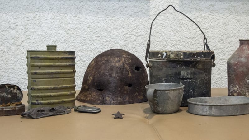 Стремясь показать обе стороны конфликта, заведующий «Солдатами Отечества» привёз из Монголии практически полный комплект снаряжения японского пехотинца. В нём и простреленная каска, и котелок с чашкой, и фильтр от противогаза, и коробочка с ветошью и смазкой для винтовки, и фляжка в одну пинту – производство более вместительных наладят позднее, в годы второй мировой войны. «Ещё должны быть палочки для еды», – добавляет Трофименко. Несмотря на то что их изготавливали из дюраля, найти достаточно мелкий и недолговечный предмет не так просто. В отличие, скажем, от котелка и ёмкостей, которые входили в один комплект с ним. Дело в том, что использовать крышку от него как полноценную тарелку было нельзя – мешали прорези по бокам, сделанные под ушки для крепления рукоятки. Поэтому вместе с котелком солдат получал не только дюралевую чашечку для питья, но и отдельную тарелку. Снаряжение советских воинов было более простым и технологичным – немаловажное обстоятельство в условиях тотальной войны, когда простота массового производства чего бы то ни было для нужд армии становится стратегическим преимуществом.