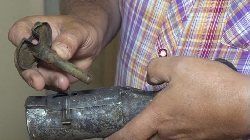 «В Иркутске такого нет нигде – я, по крайней мере, знаю только муляж этого предмета», – демонстрирует Трофименко одну из находок. В его руках РГ-14 – ручная граната Рдултовского образца 1914 года. Форма вполне привычная – кто-то даже вспомнит деревянные учебные макеты с занятий по военной подготовке. Но вместо чеки – клавиша на рукояти. Цилиндрический корпус сделан из жести, внутри – металлическая решётка с крестообразными прорезями, которая при взрыве разлеталась на две сотни осколков. Взрывчатого вещества, само собой, нет – никто не станет выставлять в музее действующее боевое оружие.