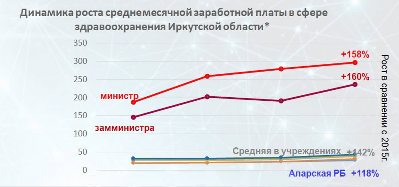Зарплата министра здравоохранения Иркутской области почти в 10 раз больше, чем средняя зарплата медиков в регионе. К тому же вознаграждение за работу министра и двух его заместителей в последние годы росло быстрее, чем у врачей и медсестёр. Несмотря на то что их зарплаты должны были существенно прибавиться по указу президента. Вышло по-другому. Среднемесячный доход министра здравоохранения Иркутской области составляет 300 тысяч рублей, темп роста за последние четыре года – 58%. У двух замов темп роста ещё более впечатляющий – 60%. При этом средняя зарплата врачей и медсестёр выросла лишь на 42%. Медики получают в среднем 39 тысяч рублей.