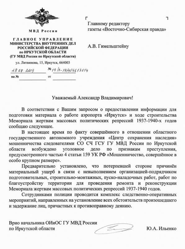 В нём говорится следующее: «В настоящее время по факту совершённого в отношении областного государственного автономного учреждения «ЦСН» мошенничества следователями СО СЧ ГСУ ГУ МВД России по Иркутской области возбуждено уголовное дело по признакам преступления, предусмотренного частью 4 статьи 159 УК РФ «Мошенничество, совершённое в особо крупном размере». Предварительно установлено, что потерпевшей стороне причинён материальный ущерб в связи с невыполнением организацией-подрядчиком подготовительных, строительно-монтажных, пуско-наладочных работ, работ по благоустройству территории для проведения ремонта и реконструкции Мемориала жертвам массовых политических репрессий 1937–1940 годов».