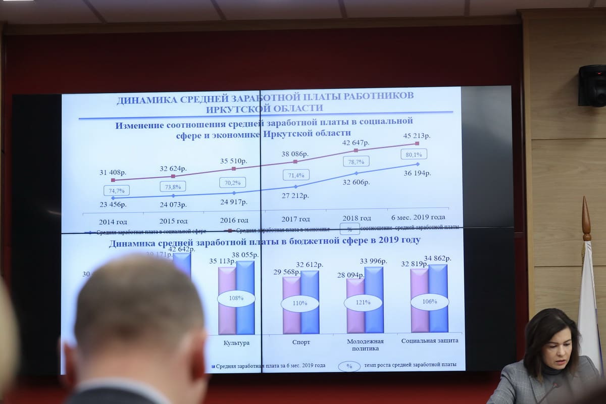 Сегодня бюджетников 194 тыс. человек, 26% от среднесписочной численности работающих в Иркутской области. Средняя заработная плата в целом по экономике составляет 45,2 тыс. рублей (в среднем по России – 46,3 тыс.). Министр труда и занятости Наталья Воронцова заявила, что в 2014 году соотношение между зарплатой бюджетника и средней по экономике составляло 74%, сегодня – более 80%. В социальной сфере в 2014 году средняя зарплата была 24,4 тыс., сейчас – 36,1 тыс. рублей. «На сегодняшний день темпы роста заработной платы в бюджетной сфере на порядок выше темпов роста зарплаты в экономике. Зарплата в нашей области прирастает заработной платой в бюджете», – сказала министр. В 2018 году, со слов Воронцовой, все указы президента в отношении бюджетников были выполнены на 100% и даже с превышением за исключением «незначительного недостижения по среднему и младшему медицинскому персоналу». По реализации указов президента Иркутская область находится на третьем месте в СФО после Томской области и Красноярского края.