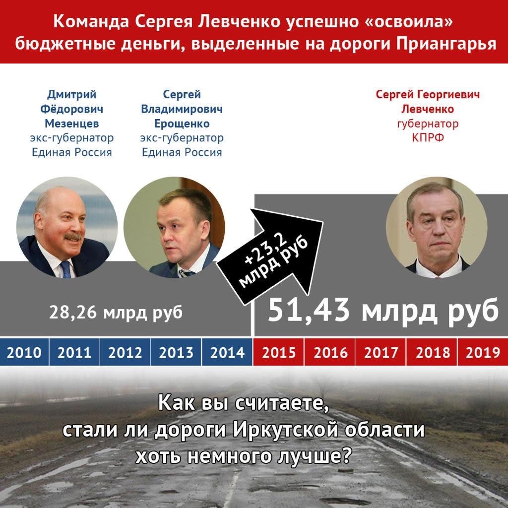 О том, что с областными дорогами особо ничего не изменилось, говорят и сухие факты. За четыре полных года «правления» Левченко ввод в эксплуатацию по строительству и реконструкции дорог областного значения составил 137,2 км, и это всего на 34% больше, чем за сравниваемый период 2012–2015 годов. При этом надо учитывать, что на первые годы работы Сергея Ерощенко выпало завершение строительства мостового перехода через Ангару в городе Иркутске, и это отвлекало значительные денежные ресурсы из бюджета области, но не давало никакой позитивной статистики введённых в эксплуатацию километров новых дорог.