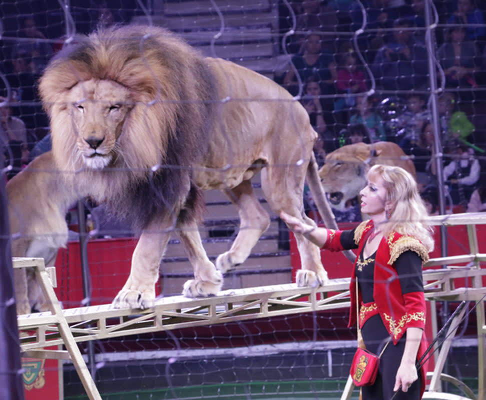 Первый сюрприз для зрителей – самые настоящие белые и жёлтые львы, привезённые с ферм Южной Африки, где их специально разводят. В отличие от жёлтых белые львы крупнее, царственнее. «Всего у нас восемь «царей зверей»: четыре белых и четыре жёлтых, три львицы и пять львов, – рассказала Надежда. – Каждое животное – со своим уникальным характером, умениями и навыками. Львам и львицам – по девять лет. Они опытные цирковые артисты».