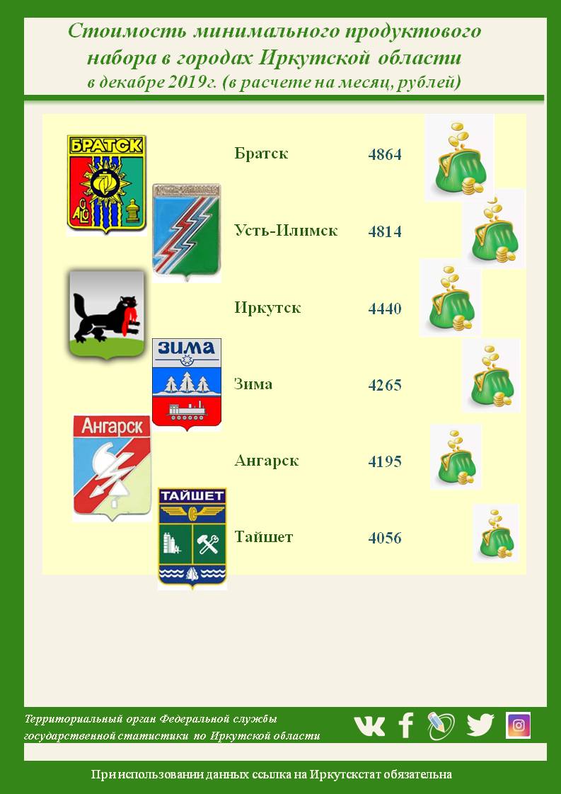 По регионам и крупным городам регулярно определяется стоимость условного (минимального) набора основных продуктов питания, которая включается в расчёт прожиточного минимума. В среднем по Иркутской области в расчёте на месяц в декабре 2019 г. она составила 4478 рублей и выросла за год на 5,9%.