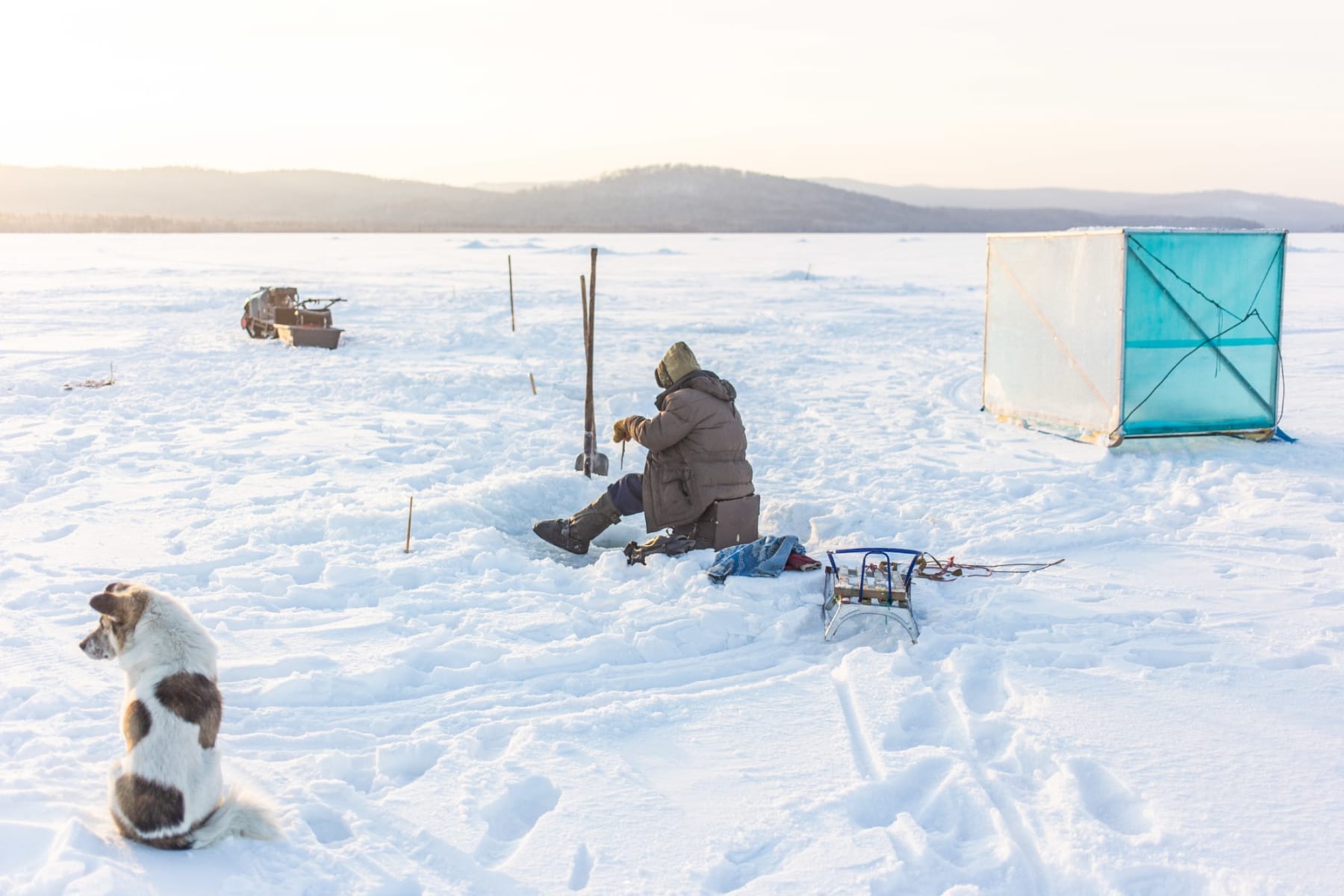 На берегу несколько рыбаков. Один нанизывает на крючок бормыша, местного рачка, опускает приманку под лёд и принимается мелко трясти короткой удочкой. Периодически он чистит большой ложкой с отверстиями ледяную кашу, которая намерзает на поверхности лунки. И так несколько часов подряд. Тем же занят его сосед у другой лунки. Парни говорят, что рыбалка помогает им очистить мысли, отвлекает от забот. Улов не важен. Для них это отдых.